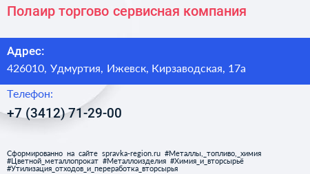 Полаир, торгово-сервисная компания по адресу 426010, Удмуртия, Ижевск, Кирзаводская, 17а в дальнейшем Организация, размещена в следующих категориях: