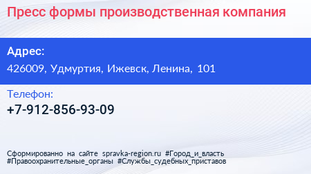Пресс-формы, производственная компания по адресу 426009, Удмуртия, Ижевск, Ленина, 101 в дальнейшем Организация, размещена в следующих категориях: