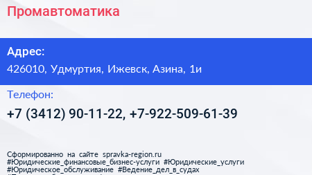 Промавтоматика по адресу 426010, Удмуртия, Ижевск, Азина, 1и в дальнейшем Организация, размещена в следующих категориях: