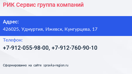 РИК Сервис, группа компаний по адресу 426025, Удмуртия, Ижевск, Кунгурцева, 17 в дальнейшем Организация, размещена в следующих категориях: