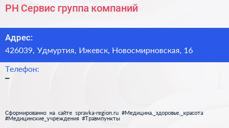 РН-Сервис, группа компаний по адресу 426039, Удмуртия, Ижевск, Новосмирновская, 16 в дальнейшем Организация, размещена в следующих категориях: