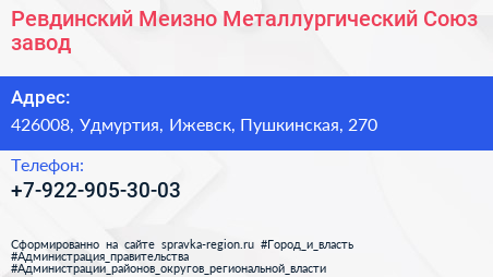 Ревдинский Меизно-Металлургический Союз, завод по адресу 426008, Удмуртия, Ижевск, Пушкинская, 270 в дальнейшем Организация, размещена в следующих категориях: