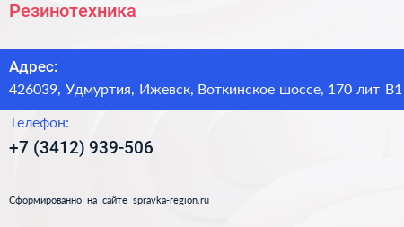 Резинотехника по адресу 426039, Удмуртия, Ижевск, Воткинское шоссе, 170 лит В1 в дальнейшем Организация, размещена в следующих категориях: