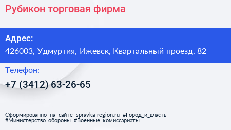 Рубикон, торговая фирма по адресу 426003, Удмуртия, Ижевск, Квартальный проезд, 82 в дальнейшем Организация, размещена в следующих категориях: