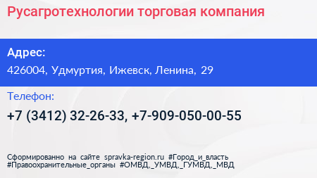 Русагротехнологии, торговая компания по адресу 426004, Удмуртия, Ижевск, Ленина, 29 в дальнейшем Организация, размещена в следующих категориях: