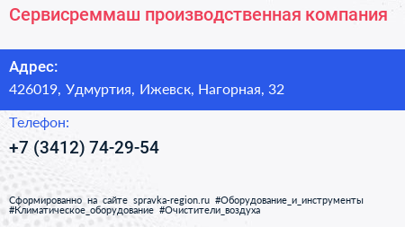 Сервисреммаш, производственная компания по адресу 426019, Удмуртия, Ижевск, Нагорная, 32 в дальнейшем Организация, размещена в следующих категориях: