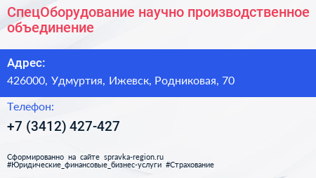 СпецОборудование, научно-производственное объединение по адресу 426000, Удмуртия, Ижевск, Родниковая, 70 в дальнейшем Организация, размещена в следующих категориях: