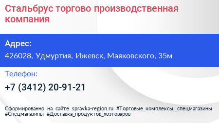 Стальбрус, торгово-производственная компания по адресу 426028, Удмуртия, Ижевск, Маяковского, 35м в дальнейшем Организация, размещена в следующих категориях: