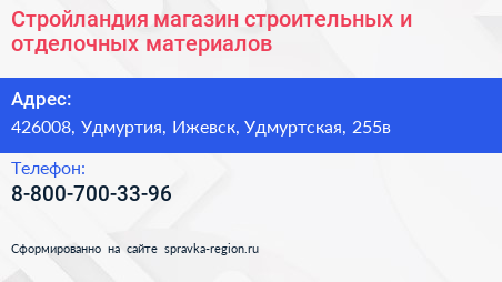 Стройландия, магазин строительных и отделочных материалов по адресу 426008, Удмуртия, Ижевск, Удмуртская, 255в в дальнейшем Организация, размещена в следующих категориях: