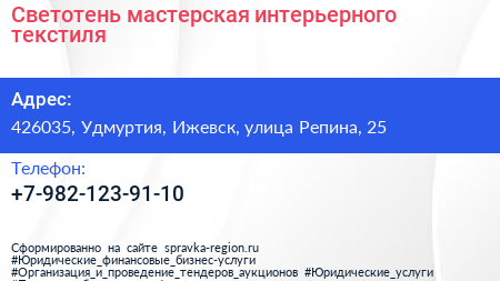 Светотень, мастерская интерьерного текстиля по адресу 426035, Удмуртия, Ижевск, улица Репина, 25 в дальнейшем Организация, размещена в следующих категориях: