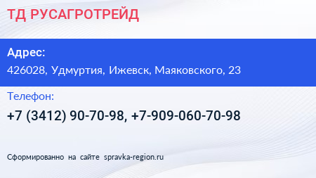 ТД РУСАГРОТРЕЙД по адресу 426028, Удмуртия, Ижевск, Маяковского, 23 в дальнейшем Организация, размещена в следующих категориях: