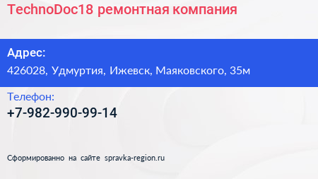 TechnoDoc18, ремонтная компания по адресу 426028, Удмуртия, Ижевск, Маяковского, 35м в дальнейшем Организация, размещена в следующих категориях: