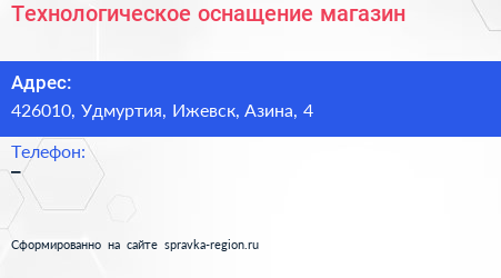 Технологическое оснащение, магазин по адресу 426010, Удмуртия, Ижевск, Азина, 4 в дальнейшем Организация, размещена в следующих категориях: