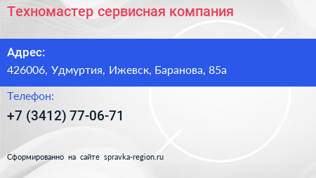 Техномастер, сервисная компания по адресу 426006, Удмуртия, Ижевск, Баранова, 85а в дальнейшем Организация, размещена в следующих категориях: