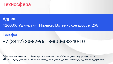 Техносфера по адресу 426039, Удмуртия, Ижевск, Воткинское шоссе, 298 в дальнейшем Организация, размещена в следующих категориях: