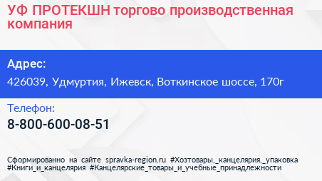 УФ-ПРОТЕКШН, торгово-производственная компания по адресу 426039, Удмуртия, Ижевск, Воткинское шоссе, 170г в дальнейшем Организация, размещена в следующих категориях: