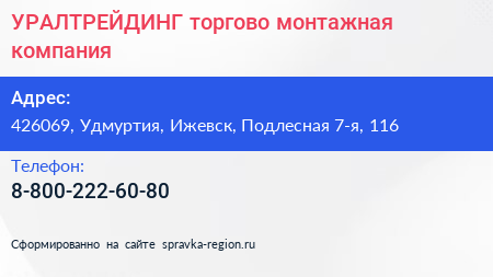 УРАЛТРЕЙДИНГ, торгово-монтажная компания по адресу 426069, Удмуртия, Ижевск, Подлесная 7-я, 116 в дальнейшем Организация, размещена в следующих категориях:
