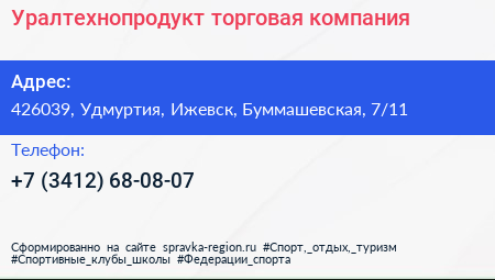 Для связи с организацией воспользуйтесь номером телефона: +7 (3412) 68-08-07. Пн: c 09:00-17:00, Вт: c 09:00-17:00, Ср: c 09:00-17:00, Чт: c 09:00-17:00, Пт: c 09:00-16:00, Сб: выходной, Вс: выходной, вы можете обратиться в эту организацию.
