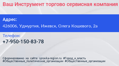 Ваш Инструмент, торгово-сервисная компания по адресу 426006, Удмуртия, Ижевск, Олега Кошевого, 2а в дальнейшем Организация, размещена в следующих категориях: