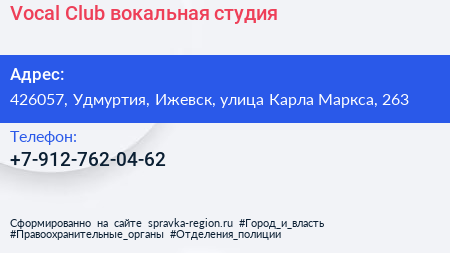 Vocal Club, вокальная студия по адресу 426057, Удмуртия, Ижевск, улица Карла Маркса, 263 в дальнейшем Организация, размещена в следующих категориях: