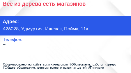 Всё из дерева, сеть магазинов по адресу 426028, Удмуртия, Ижевск, Пойма, 11а в дальнейшем Организация, размещена в следующих категориях: