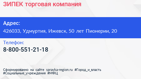 ЗИПЕК, торговая компания по адресу 426033, Удмуртия, Ижевск, 50 лет Пионерии, 20 в дальнейшем Организация, размещена в следующих категориях: