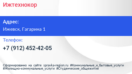 Ижтехнокор по адресу Ижевск, Гагарина 1 в дальнейшем Организация, размещена в следующих категориях: