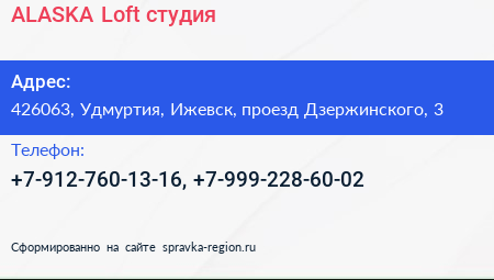 ALASKA Loft, студия по адресу 426063, Удмуртия, Ижевск, проезд Дзержинского, 3 в дальнейшем Организация, размещена в следующих категориях: