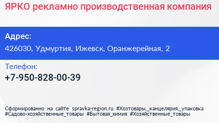 ЯРКО, рекламно-производственная компания по адресу 426030, Удмуртия, Ижевск, Оранжерейная, 2 в дальнейшем Организация, размещена в следующих категориях: