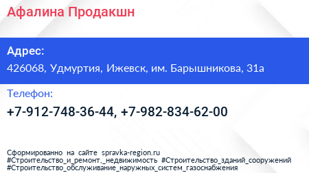 Афалина Продакшн по адресу 426068, Удмуртия, Ижевск, им. Барышникова, 31а в дальнейшем Организация, размещена в следующих категориях:
