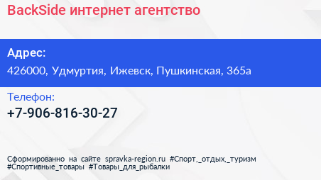 BackSide, интернет-агентство по адресу 426000, Удмуртия, Ижевск, Пушкинская, 365а в дальнейшем Организация, размещена в следующих категориях: