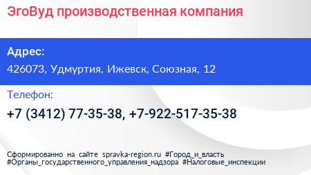 ЭгоВуд, производственная компания по адресу 426073, Удмуртия, Ижевск, Союзная, 12 в дальнейшем Организация, размещена в следующих категориях: