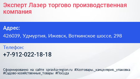 Эксперт Лазер, торгово-производственная компания по адресу 426039, Удмуртия, Ижевск, Воткинское шоссе, 298 в дальнейшем Организация, размещена в следующих категориях: