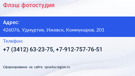 Флэш, фотостудия по адресу 426076, Удмуртия, Ижевск, Коммунаров, 201 в дальнейшем Организация, размещена в следующих категориях:
