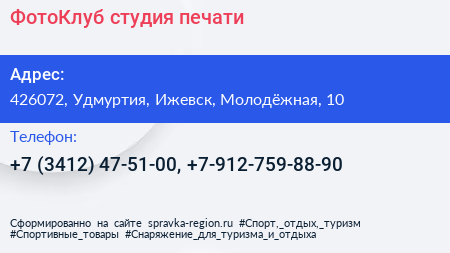 ФотоКлуб, студия печати по адресу 426072, Удмуртия, Ижевск, Молодёжная, 10 в дальнейшем Организация, размещена в следующих категориях: