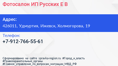 Фотосалон, ИП Русских Е.В. по адресу 426011, Удмуртия, Ижевск, Холмогорова, 19 в дальнейшем Организация, размещена в следующих категориях: