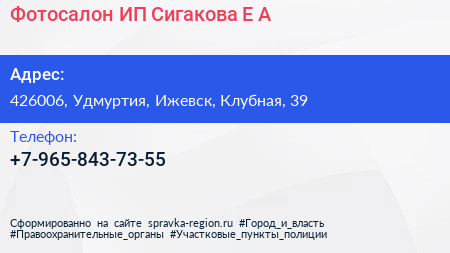 Фотосалон, ИП Сигакова Е.А. по адресу 426006, Удмуртия, Ижевск, Клубная, 39 в дальнейшем Организация, размещена в следующих категориях: