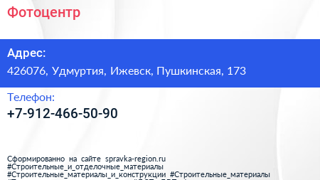 Фотоцентр по адресу 426076, Удмуртия, Ижевск, Пушкинская, 173 в дальнейшем Организация, размещена в следующих категориях: