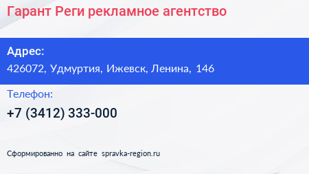 Гарант-Реги, рекламное агентство по адресу 426072, Удмуртия, Ижевск, Ленина, 146 в дальнейшем Организация, размещена в следующих категориях: