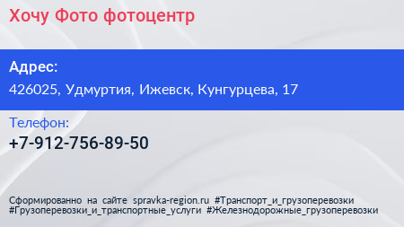 Хочу Фото, фотоцентр по адресу 426025, Удмуртия, Ижевск, Кунгурцева, 17 в дальнейшем Организация, размещена в следующих категориях: