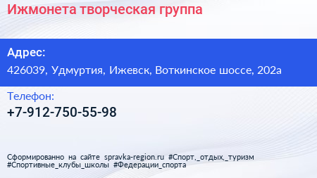 Ижмонета, творческая группа по адресу 426039, Удмуртия, Ижевск, Воткинское шоссе, 202а в дальнейшем Организация, размещена в следующих категориях: