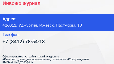 Инвожо, журнал по адресу 426011, Удмуртия, Ижевск, Пастухова, 13 в дальнейшем Организация, размещена в следующих категориях: