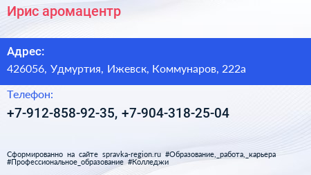 Ирис, аромацентр по адресу 426056, Удмуртия, Ижевск, Коммунаров, 222а в дальнейшем Организация, размещена в следующих категориях: