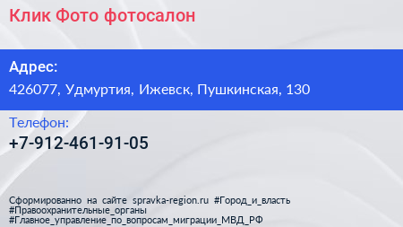 Клик Фото, фотосалон по адресу 426077, Удмуртия, Ижевск, Пушкинская, 130 в дальнейшем Организация, размещена в следующих категориях: