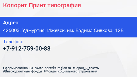 Колорит-Принт, типография по адресу 426003, Удмуртия, Ижевск, им. Вадима Сивкова, 12В в дальнейшем Организация, размещена в следующих категориях: