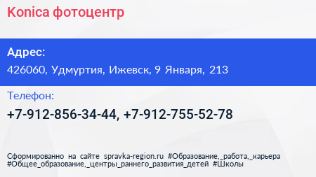 Konica, фотоцентр по адресу 426060, Удмуртия, Ижевск, 9 Января, 213 в дальнейшем Организация, размещена в следующих категориях:
