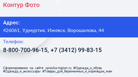 Контур-Фото по адресу 426061, Удмуртия, Ижевск, Ворошилова, 44 в дальнейшем Организация, размещена в следующих категориях:
