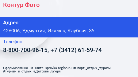 Контур-Фото по адресу 426006, Удмуртия, Ижевск, Клубная, 35 в дальнейшем Организация, размещена в следующих категориях: