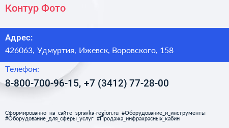Контур-Фото по адресу 426063, Удмуртия, Ижевск, Воровского, 158 в дальнейшем Организация, размещена в следующих категориях: