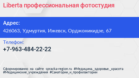 Liberta, профессиональная фотостудия по адресу 426063, Удмуртия, Ижевск, Орджоникидзе, 67 в дальнейшем Организация, размещена в следующих категориях: